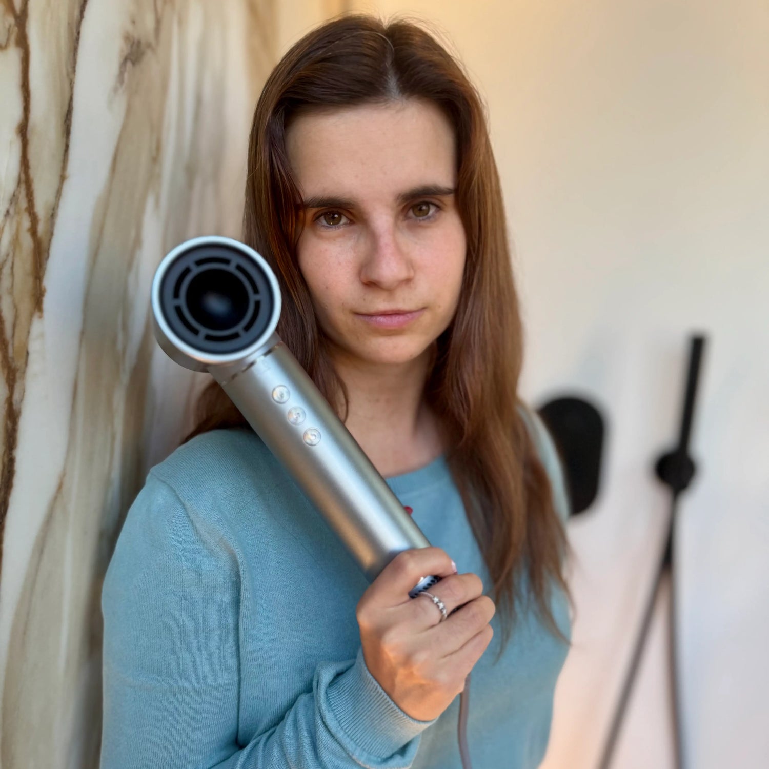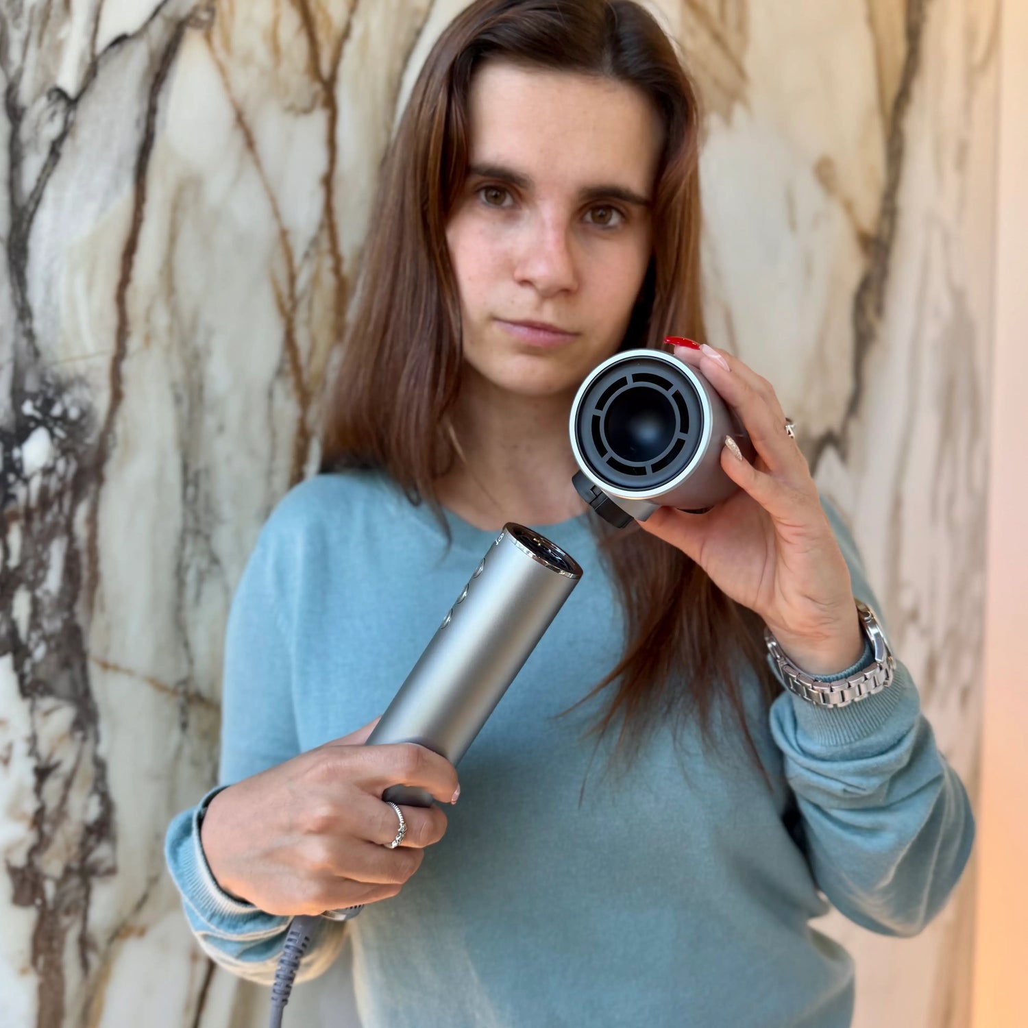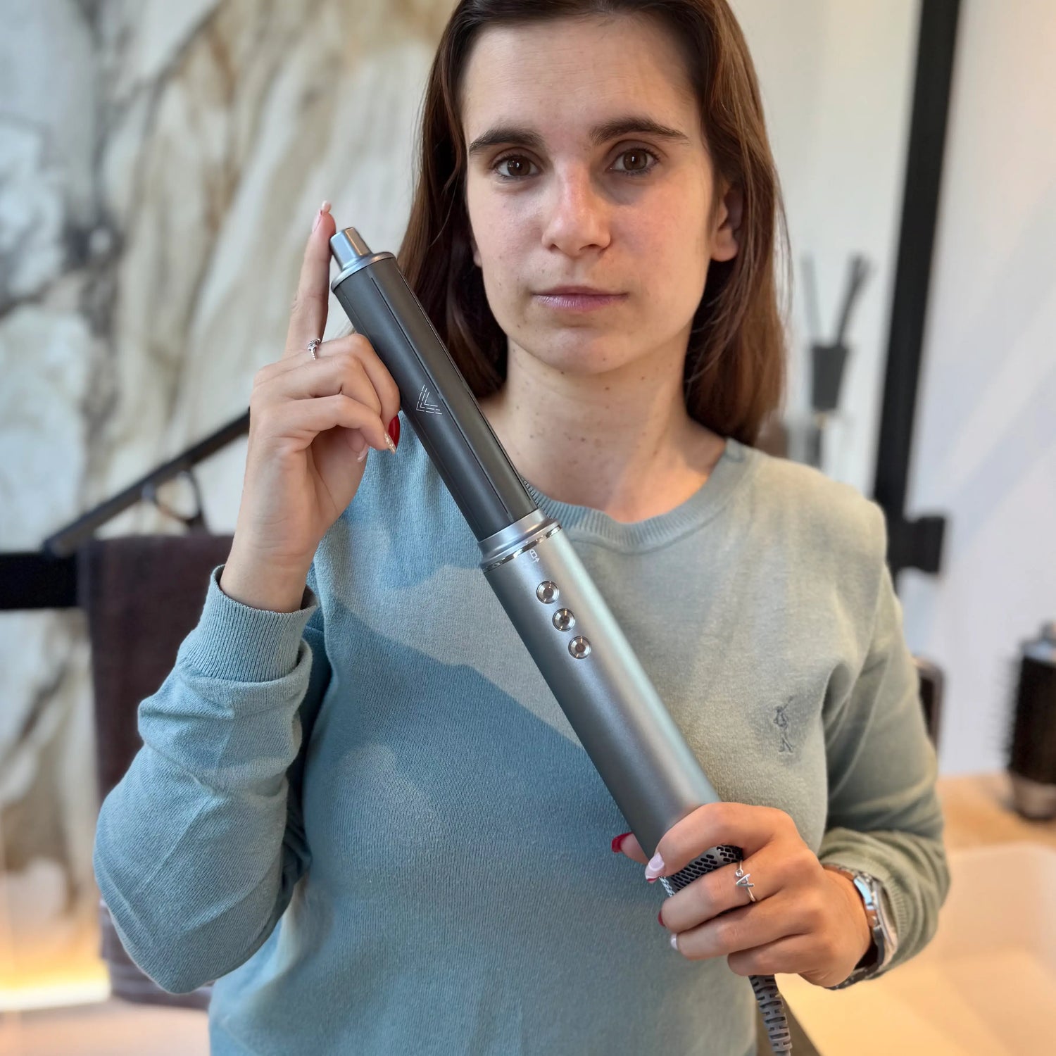 Peluquera certificada, Centro Room: "Recomiendo Air Glow™ a mis clientas que quieren peinarse en casa sin dañar su cabello. Es práctico, potente y deja un acabado de peluquería."
